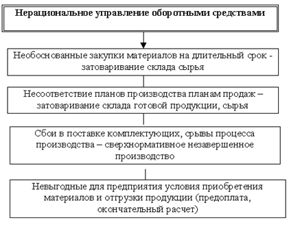 При нормальных условиях работы предприятия, когда не нарушаются условия снабжения предприятия сырьем и материалами, не прерывается процесс производства и реализации продукции, а также процесс банковских расчетов за реализованную продукцию, фактические оборотные активы соответствуют потребности предприятия. Скорость их движения более или менее синхронна. Но если увеличиваются, например, запасы готовой продукции на складе предприятия, то, как следствие, замедляется оборот, происходит накопление оборотных активов в запасах готовой продукции, что приводит к ситуации, когда на предприятии не хватает денежных средств для приобретения очередной партии материалов.
