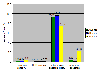 3. В структуре оборотных средств произошло увеличение удельного веса по запасам и затратам (на 1,14% в 2008 году), налогу на добавленную стоимость (на 0,03% в 2008 году) и денежным средствам (на 21,29% в 2008 году) и разительное уменьшение по дебиторской задолженности (на 22,46% в 2008 году). Дебиторская задолженность составляют большую часть оборотных активов, на конец 2008 года составила 73,98%, это негативная тенденция, показывающая, что предприятие не сможет нормально работать, пока не получит хотя бы половину своей задолженности.