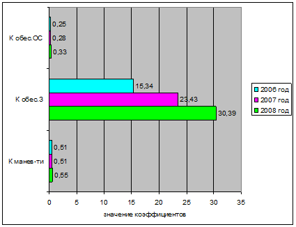 5. Коэффициент обеспеченности ООО «НОВАТЭК – ТРАНСЕРВИС» СОС в 2006 году составил 0,55, в 2007 году и 2008 году по 0,51. Значение данного коэффициента по данным предприятия больше 0,1, следовательно структура баланса признана удовлетворительной, а предприятие платежеспособным. Коэффициент обеспеченности запасов в среднем за три года составляет 23,05. Значение этого показателя довольно далеко от нормативного, что показывает на полное формирование запасов из собственных источников предприятия. Коэффициент маневренности в среднем равен 0,29, это означает, что только 1/4 частью собственных оборотных средств можно относительно свободно маневрировать и показывает на небольшую устойчивость оборотных активов.