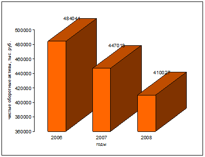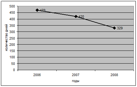 6. Делая выводы по длительности нахождения оборотных средств в обороте в течение трех лет можно отметить, что длительность одного полного оборота составляет в среднем 406 дней и за один год не успевает проходить полного оборота, но в 2008 году ситуация улучшается и один оборот составляет 329 дней, на каждый 1 рубль вложенный в оборотные активы предприятие получает в среднем 0,91 рубля чистой выручки, а на каждый 1 рубль реализованной продукции приходиться 1,13 рублей оборотных средств.