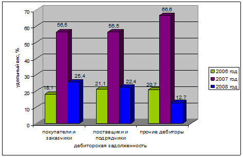 7. По итогам анализа состава и структуры дебиторской задолженности можно отметить, что задолженность к концу 2008 года сокращается почти на 30%, наибольшую часть занимает задолженность поставщиков и подрядчиков, наименьшую – прочих дебиторов. Это показывает, что в ООО «НОВАТЭК – ТРАНСЕРВИС» ведется правильная политика по регулированию дебиторской задолженности, наращивание темпа реализации услуг и осмотрительной кредитной политики.