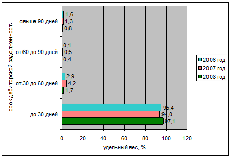 8. Давность дебиторской задолженности не превышают одного месяца со дня отгрузки товара и в 2006 году составляет 97,1%, в 2007 году – 94,0% и в 2008 году – 95,4. Однако, следует обратить внимание на то, что существует задолженность, по которой срок погашения превышает 90 дней и более, к тому же в 2008 году она увеличивается до 1,6%. Работа с данными организациями-должниками должна быть белее тщательной. Одним из вариантов по взиманию долг может быть обращение в хозяйственный суд.