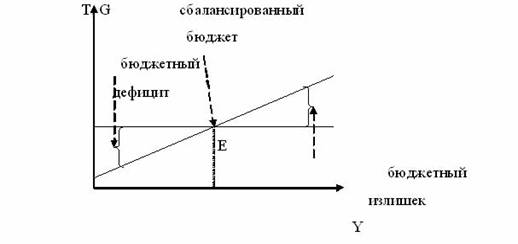 Рис.1. Государственные расходы, налоговые поступления и дефицит государственного бюджетаG - государственные расходы; T - налоговые поступления; Y - доход. В точке E - сбалансированный бюджет, т.е. налоговые поступления равны государственным расходам T=G
