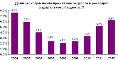 Расходы на обслуживание государственного долга Российской Федерации составят в 2010 году 333,2 млрд. рублей, в 2011 году - 487,3 млрд. рублей и в 2012 году - 602,9 млрд. рублей. Доля расходов на обслуживание госдолга в расходах федерального бюджета увеличится при этом с 2,4% в 2009 году до 6,2% в 2012 году (рис.4.3).