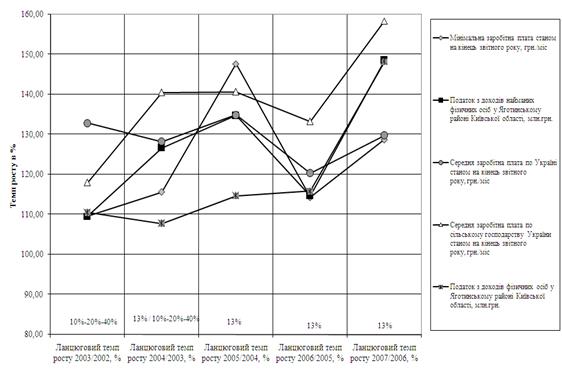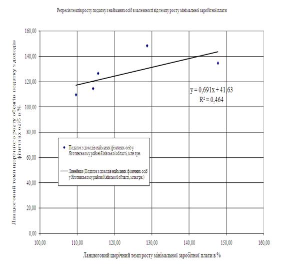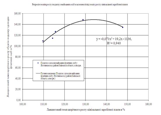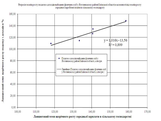 Результати кореляційно-регресійного аналізу регуляторного впливу податкових ставок на дохід фізичних осіб в 2002–2003 роках (прогресивна система ставок) та в 2004–2007 роках (лінійно-пропорціональна система ставок), отримані для Яготинського сільського району Київської області, показали: