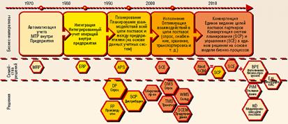 В 1980-х годах, с ростом популярности "вытягивающего" (pull) подхода к производству товаров, основанного на обратной связи с конечным потребителем и созданием товаров под конкретные требования клиентов, бизнес-императивом, определяющим развитие ИС управления бизнесом, стала адаптация производства к прогнозируемому спросу, т. е. "обратное распространение" требований спроса вниз по цепочке стоимости - от сбыта через логистику к производству. Главными условиями победы в конкурентной борьбе в тот период начали считать своевременную и точную поставку качественного сырья и материалов и быструю адаптацию характеристик товара к требованиям спроса. Ведущие менеджеры пришли к выводу, что эффективное взаимодействие с поставщиками сырья и материалов - важнейшая составляющая в их способности быстро, точно и качественно удовлетворять постоянно меняющиеся требования заказчиков. Возникшие в результате новые принципы управления бизнесом были основаны на технологиях минимизации издержек, повышения производительности труда и скорости доставки товара, а главное - лучшей организации управления бизнес-процессами.