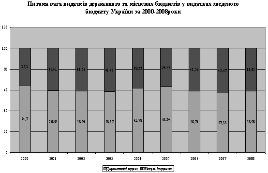 З 2001 по 2003р.р. частка витрат місцевих бюджетів в витратах зведеного бюджету поступово збільшилася з 40,41 до 41,63% або на 1,22%. Це свідчить про те, що в цьому році відбулася певна децентралізація у відносинах між ланками бюджетної системи. Однак, починаючи з 2004 по 2005р.р. питома вага видатків місцевих бюджетів у зведеному бюджеті країни неухильно знижується, що свідчить про подальше посилення впливу центральних органів влади на розподіл коштів. Так, в 2004 році частка видатків місцевих бюджетів у зведеному бюджеті України із 38,22% знизилась до 36,76 % в 2005 році. В 2006-2007р.р. знову відбувається поступове збільшення питомої ваги видатків місцевих бюджетів у зведеному бюджеті країни з 36,76% у 2005р. до 42,67% у 2007р. або на 5,91%. Але, в 2008р. знову знижується питома вага видатків до 41,02% або на 1,65%. Для наочного уявлення про співвідношення видатків Державного та місцевих бюджетів у зведеному бюджеті України за даними таблиці 1.2. складемо діаграму 1.1.