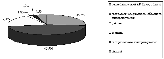 Місцеві бюджети мають свою внутрішню структуру та характерні відмінності. Структура місцевих бюджетів розглянута на діаграмі 1.1. Так, незважаючи на те, що на сьогодні налічується місцевих бюджетів усього понад 12 тис., а найчисельнішу групу становить сільські й селищні бюджети – більш, як 10 тис., понад 72 відсотки всіх витрат місцевих бюджетів здійснюється через обласні бюджети (їх 25) та бюджети міст загальнодержавного і обласного підпорядкування (їх 203).Нині витрати республіканського бюджету АР Крим та обласних бюджетів становить 26,5 відсотка від загального обсягу витрат місцевих бюджетів, а бюджетів міст загальнодержавного та обласного підпорядкування – 45,9, районних бюджетів – 19,4 відсотка. Значно меншу частку становлять витрати інших видів місцевих бюджетів: сільських – 4,5 відсотка, міст районного підпорядкування – 1,9 відсотка, селищних – 1,8 відсотка (рис. 1.1.)