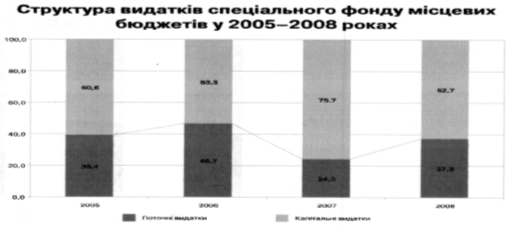 Проте з 2005 по 2008 р.р. знову відбулося зростання питомої ваги витрат місцевих бюджетів у ВВП з 11,80 до 13,35 % або на 1,55%.