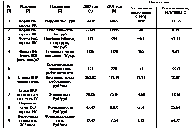 Как видно из таблицы №1.1.1. произошло уменьшение выручки на 4896 тыс. рублей. Сокращение сети в 2009 году стало причиной уменьшения доходов предприятия в сравнении с 2008 годом. Затраты также были сокращены. За счет роста цен на входящее сырье себестоимость увеличилась на 44 тыс. рублей. Первоначальная стоимость основных средств увеличилась на 9.01%. Прибыль от продаж резко снизилась, ее прирост имеет отрицательное значение и составляет -71.14%. Но сам факт наличия прибыли от продаж говорит о том, что выручка от продаж не просто покрыла, но и превысила расходы на продажу. Наблюдается увеличение производительности труда от 188.91 руб./чел. до 252.82 руб./чел. Фондоотдача основных средств – отражает сумму реализуемой продукции на рубль первоначальной стоимости основных средств, ее значение снизилось на 18.69%, из-за снижения выручки на 11.36%.
