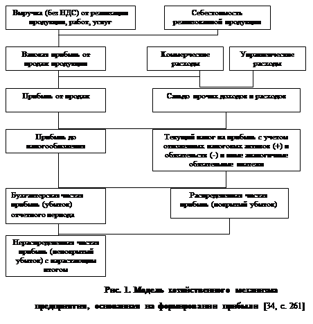 Теоретической базой экономического анализа финансовых результатов деятельности организации является принятая для всех организаций, независимо от форм собственности, единая модель хозяйственного механизма в условиях рыночных отношений, основанная на формировании прибыли (см. рис. 1). Она отражает присущее всем организациям, функционирующим в условиях рынка в качестве независимых товаропроизводителей, единство: целей деятельности, показателей финансовых результатов деятельности, процессов формирования и распределения прибыли, системы налогообложения. Таким образом, основной источник доходов предприятия – выручка от реализации продукции, а именно та её часть, которая остается за вычетом материальных, трудовых и денежных затрат на производство и реализацию. [31, с. 124].