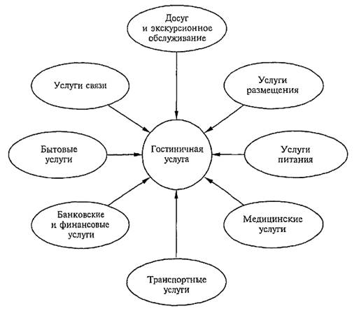Следует отметить, что ресторанно-гостиничные услуги носят комплексный характер и состоят из разнообразных услуг, предоставляемых различными сферами, образуя единый продукт в виде «пакета услуг», подобранных для клиента в зависимости от уровня его потребностей. Однако такой «пакет» не носит жесткого характера, и клиент самостоятельно варьирует его составляющими[5] .