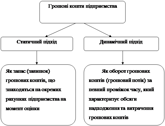 Рис.1.1. Характеристика статичного і динамічного підходу до визначення грошових коштів підприємства
