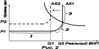 Инфляция издержек может быть изображена графически (рис. 2). Смещение кривой совокупного предложения влево (AS1 -AS2 ) в результате действия указанных причин отражает увеличение издержек на единицу продукции, возрастают цены, сокращается реальный объем производства или реальный ЧНП.