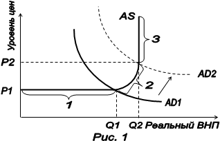 ), и если экономика находится на промежуточном (2) или классическом (3) отрезках кривой совокупного предложения, то это ведет к росту цен, что представляет инфляцию спроса."