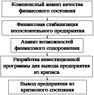 Процесс антикризисного управления состоит из нескольких последовательных этапов, состав и содержание которых зависит от степени состоятельности: анализ качества финансового состояния, финансовая стабилизация, анализ возможностей финансового оздоровления, разработка инвестиционной программы для вывода предприятия из кризиса, выведение предприятия из кризиса.
