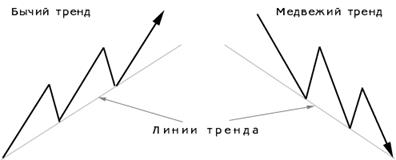 Линию тренда проводят через несколько точек, являющимися локальными экстремумами. Для бычьего тренда эта линия располагается ниже ценового графика. Данная линия будет ограничивать снизу движения цен. Для медвежьей тенденции линия тренда рисуется сверху и ограничивает возможные движения цен вверх.