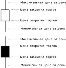 Японские свечи строятся на дневных графиках по ценам открытия/закрытия и минимумам/максимумам за день. Если цена закрытия выше цены открытия, то между ними рисуется белый прямоугольник, если наоборот – то черный. Данный прямоугольник называется телом свечи. Цвет тела свечи имеет большое значение при графическом анализе.