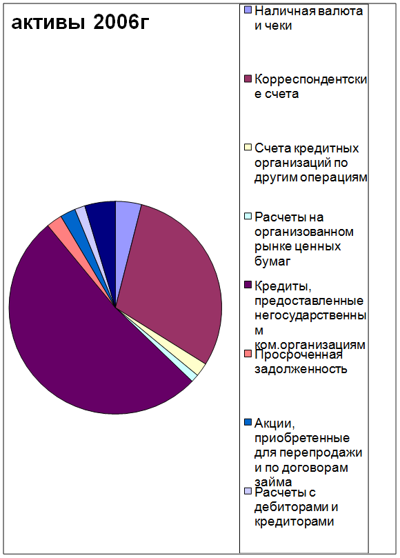 В 2006 году наибольший удельный вес в пассивах составили кредиты, предоставленные негосударственным коммерческим организациям (46,54%). Среди них основными являются кредиты, предоставленные негосударственным коммерческим организациям на срок от 1 года до 3 лет (18,88%), и на срок от 8 до 30 дней (15,44%). В 2007 году удельный вес этого показателя немного снизился (46,22%) (кредиты, предоставленные негосударственным коммерческим организациям на срок от 1 года до 3 лет - 13,66%, и на срок от 8 до 30 дней - 15,37%), однако абсолютная величина увеличилась на 138825 тысяч рублей. Далее по величине удельного веса располагаются корреспондентские счета. В 2006 году он составил 26,84%, но в 2007 году удельный вес, а также абсолютная величина сократились почти в 2 раза и составил 14,85%. . Это резкое снижение свидетельствует о недостаточно активной кредитной политике. Изменения произошли в статье «Наличная валюта и чеки». В 2006 году удельный вес этого показателя составлял 3,56%, а к 2007 году он увеличился в 1,5 раза и стал составлять 6,17 %.