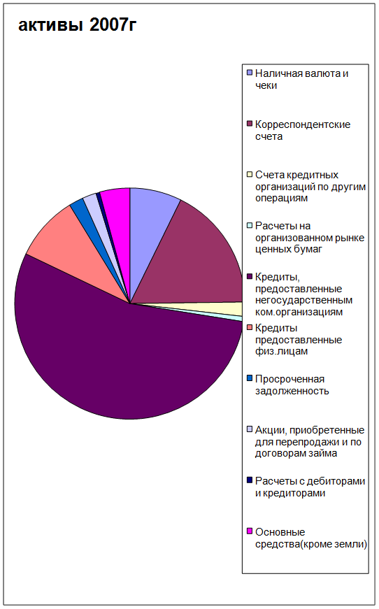 Удельный вес счетов кредитных организаций по другим операциям снизился на 0,15% (в 2006-1,86%, в 2007- 1,71%). Просроченная задолженность снизилась на 0,44%,также как и акции, приобретенные для перепродажи и по договорам займа. Основные средства снизились по удельному весу на 0,59 %, а абсолютному значению увеличились на 2249 тыс.руб. Наименьший удельный вес занимают расчеты с дебиторами и кредиторами(1,4% и 0,44%), и расчеты на организованном рынке ценных бумаг (1,7% и 0,6 % соответственно)