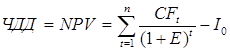 Чистый дисконтированный доход (ЧДД) соответствует показателю чистой приведенной стоимости NPV (net present value), который используется при оценке эффективности инвестиционных проектов по методике ЮНИДО и представляет собой дисконтированный показатель ценности проекта, определяемый как сумма дисконтированных значений поступлений за вычетом затрат, получаемых в каждом году в течение срока жизни проекта: