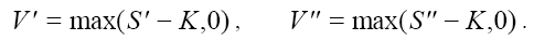 К – цена исполнения опциона, S – цена акции для узла С, V' и V" – цены опциона для узлов В и А, цена американского опциона пут, рассчитывается по формуле: