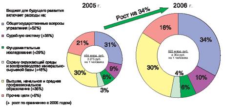 Общий объем непроцентных (не связанных с обслуживанием долга) расходов федерального бюджета в реальном выражении (с учетом инфляции) в 2006 году по сравнению с 2005 годом увеличится на 15%, а к 2008 году — на 27%.
