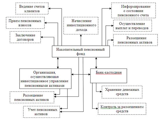 Инвестиционное управление пенсионными активами пенсионных фондов осуществляется организациями, осуществляющими инвестиционное управление пенсионными активами или пенсионным фондом самостоятельно при наличии у него соответствующей лицензии. Организация, осуществляющими инвестиционное управление пенсионными активами накопительных пенсионных фондов, является юридическим лицом, профессиональным участником рынка ценных бумаг и создается в форме акционерного общества в установленном законодательством Республики Казахстан порядке /7/. В своей деятельности накопительные пенсионные фонды, организации, осуществляющие инвестиционное управление пенсионными активами и банк-кастодиан по отношению друг к другу руководствуются положением трехстороннего кастодиального договора, в котором подробно оговариваются права и обязанности каждой из сторон и все возникающие правоотношения. Взаимодействие между этими тремя юридическими участниками пенсионного обслуживания происходит по следующей схеме: в соответствии с договором о пенсионном обеспечении между пенсионным фондом и вкладчиком взносы вкладчика-получателя поступают в банк-кастодиан, с которым у фонда заключен кастодиальный договор, на специально открытый для этого инвестиционный пенсионный счет фонда.