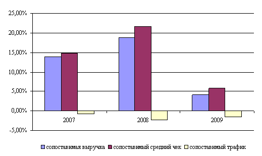 За последние три года товарооборот ОАО «Магнит» увеличился на 34,9% к фактическому товарообороту 2007года. Товарооборот фирмы за 2009 год в сопоставимых ценах составил 14516,9 млн. руб.. В сопоставимых ценах в 2009 г. товарооборот предприятия вырос по сравнению с 2007 г. на 15,59%., а темп роста по отношению к 2008году составил 11,6% или 1199,7 млн. руб. За счет сокращения количества реализованных товаров (физического объема розничного товарооборота) товарооборот сократился на 642,8 млн. руб., и в связи с увеличением розничных цен на товары товарооборот увеличился на 906,5 млн. руб.