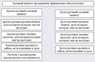 Заемный капитал, используемый предприятием, характеризует в совокупности объем его финансовых обязательств (общую сумму долга). Эти финансовые обязательства в современной хозяйственной практике дифференцируются следующим образом (рисунок 1)
