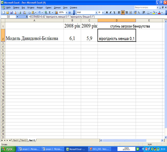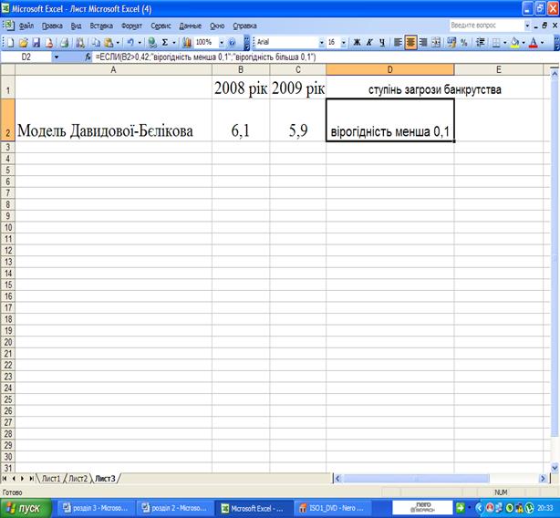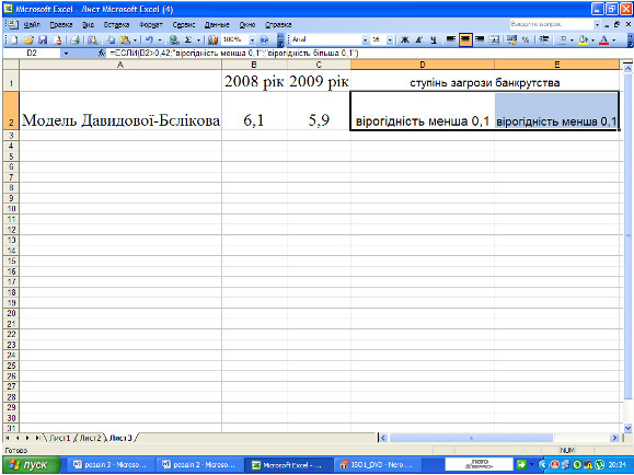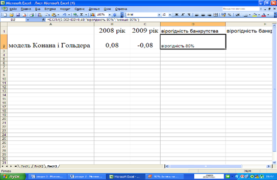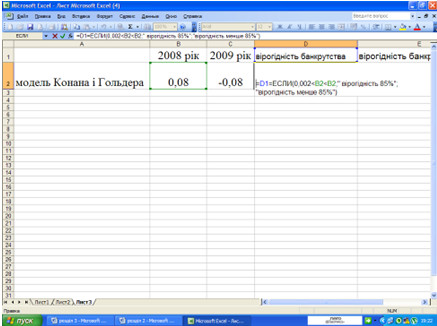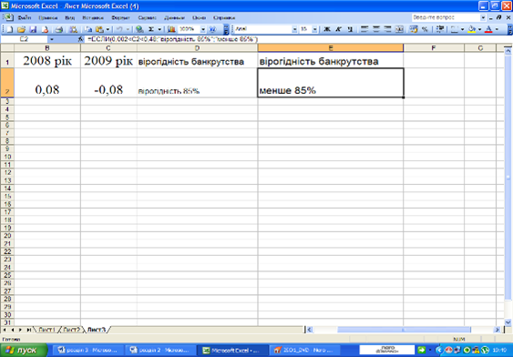 3.2 Формування аналітичних висновків про оцінку вірогідності банкрутства підприємства шляхом застосування програми Excel