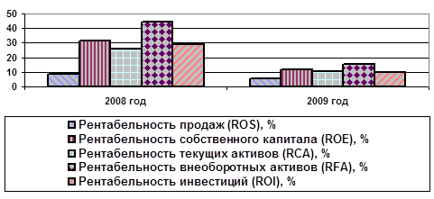 Рентабельность внеоборотных активов (отражающая эффективность использования внеоборотных активов и показывающая, какую прибыль приносит единица внеоборотного капитала предприятия) уменьшилась, что является негативным фактом, и составила 15,35%. Более наглядно изменение показателей рентабельности ОАО «Концерн «Калина» за 2008-2009 можно представить на рисунке 5.