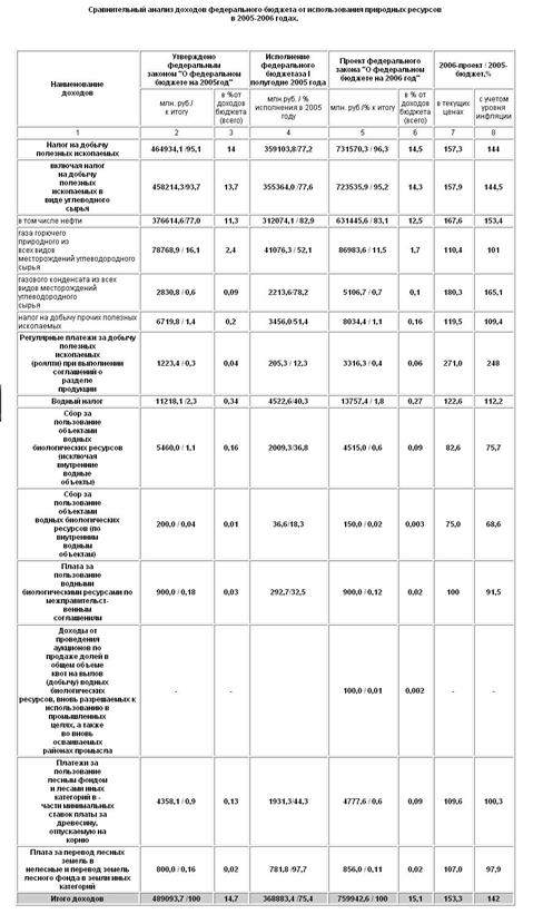 Как видно из таблицы[19] , проектируемые доходы федерального бюджета на 2006 год за счет использования природных ресурсов составили 759942,6 млн. руб. или 15,1 % от общей суммы доходов федерального бюджета, из них 13757,4 млн. руб. или 0,27% от общей суммы доходов федерального бюджета составил водный налог. Положительным является увеличение доходов от поступления водного налога в 2006 году на 2529 млн. руб. по сравнению с 2005 годом, а вот прогнозируемый рост вклада доходов от водного налога в формирование доходной части федерального бюджета в процентном соотношении снизился на 0,07%.