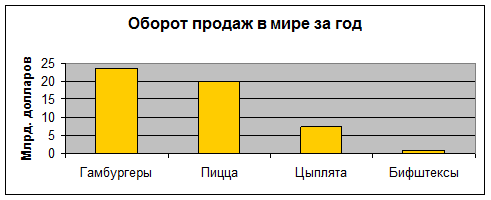Гамбургеры, конечно, в фаворитах: оборот их продаж в мире составляет 23,7 миллиарда долларов в год. Затем идут мировые операторы пиццы, их оборот превышает 20 миллиардов долларов в год. Дальше следуют цыплята - 7,3 миллиарда долларов. Ну и замыкают цепочку бифштексы - свыше 900 миллионов долларов в год.