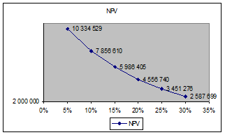 Проанализировав результаты расчета показателей экономической эффективности для трех сценариев реализации проекта можно сделать вывод, что все три варианта являются жизнеспособными, т.к. все показатели оказались в рамках нормы (NPV положительная, IRR превышает предполагаемую при расчете NPV ставку сравнения, По показателям лучший вариант – оптимистичный, однако в реальной жизни он мало вероятен. Гораздо ближе к реальности пессимистичный вариант.