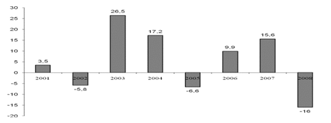 Рис. 3.1 Зміни обсягів будівельних робіт у 2001-2008 рр. (у % до попереднього року)