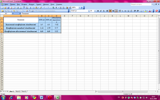 Проведення розрахунків показників ліквідності, а саме коефіцієнта загальної, швидкої та абсолютної ліквідності здійснюється наступним чином:
