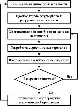 Проводить успешную стратегическую политику, обеспечивающую стабильное развитие предприятия и сведение к минимуму рисков возникновения кризисных ситуаций, позволяют специальные программы маркетинговой деятельности. Маркетинговая программа представляет собой разработанный на основе комплексных исследований рынка и собственных ресурсных возможностей план научно-технической и производственно-сбытовой деятельности предприятия на планируемый период времени, определяющий оптимальный вариант его развития. Процесс разработки маркетинговой программы не является тривиальной задачей, поэтому при его реализации необходимо применять методы системного анализа и, в частности метод структуризации (декомпозиции). На рис. 4. изображен укрупненный алгоритм работ по составлению маркетинговой программы.