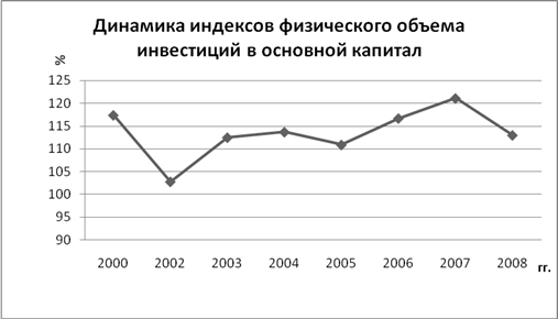 В период с 2005 по 2007 гг. наблюдается устойчивый рост индекса физического объема инвестиции в основной капитал, причем 2007 год стал рекордным – темп роста инвестиций составил 21,1%. Высокий рост инвестиционного спроса поддерживался повышением роли внутреннего рынка в формировании экономической динамики. Однако уже в 2008 году данный показатель упал до 13%, что было вызвано, прежде всего, резким сокращением свободных средств у инвесторов вследствие кризиса.