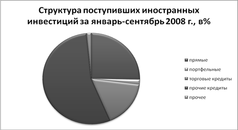 Что касается первого пункта, общая доля инвестиций из-за рубежа в основной капитал за период 2000-2008 гг. находится в пределах 6%, причем тенденция к росту здесь неустойчива. С другой стороны (второй пункт), произошло увеличение притока иностранного капитала за 12 лет более чем в 40 раз. Однако при более детальном рассмотрении исследуемой динамики выявляется более сложная картина движения иностранного капитала на российскую территорию. Действительно, доля прямых иностранных инвестиций в капитале российских компаний сравнительно невелика - не более одной четверти от их общего объема. При этом портфельные инвестиции до 2006 г. вообще не играли практически никакой роли, в 2006 г. они заметно возросли до 5,8%, но снова упали в 2007 г. Таким образом, основная часть иностранного капитала в России - это «прочие» инвестиции, т. е. кредиты.