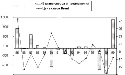 Рис. 1.1. Связь баланса спроса и предложения с ценой на нефть