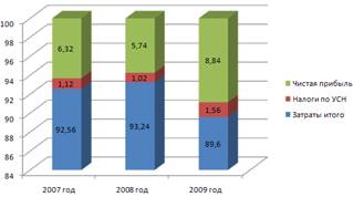 Показатели прибыли и рентабельности предпринимателя неуклонно растут. Прибыль в 2007 году составила 158400 руб. Несмотря на то, что рентабельность продаж в 2008г. (6,9%), в сравнении с 2007г. (7,6%), оказалась немного меньше, это не помешало предпринимателю получить прибыль почти в два раза больше (292,6тыс.руб.). Так прибыль в 2009 году составила 697500 руб., что по сравнению с 2007 и 2008гг. возросла на 539100 и 404900руб. соответственно. Итоговые финансовые результаты деятельности индивидуального предпринимателя растут с каждым годом, что объясняется улучшением его ассортиментной политики, политики управления ценами и повышением эффективности материально-технической базы.