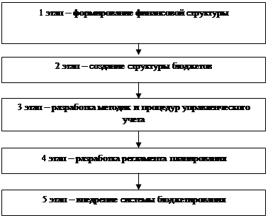 Система бюджетирования представляет собой совокупность таких элементов, как структура бюджетов, процедура формирования, согласования и утверждения бюджетов и контроль за их фактическим исполнением, нормативная база (нормы, нормативы, лимиты), типовые процедуры и механизмы принятия управленческих решений. В общем случае можно выделить пять этапов постановки системы бюджетирования в организации, они представлены на рисунке 1.1.