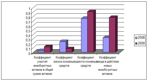 В 2008 году у исследуемого предприятия на балансе числились основные средства только «машины и оборудования» на сумму 313 тыс. руб. В 2009 году ООО «Крон-Нефто» увеличило вложения в основные средства на 1063 тыс. руб., в т.ч. построило здание магазина – 820 тыс. руб., склад 250 тыс. руб., купило транспортное средство (грузовую ГАЗель б/у) за 270 тыс.руб. Стоимость машин и оборудования уменьшилась на 13 тыс. руб. за счет начисленной амортизации.