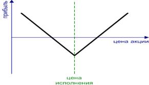 1. Стрэддл (стеллаж) (рис.4,5) - покупка опционов колл и пут с одинаковыми датами истечения и ценой исполнения. Данная стратегия – стратегия торговли волатильностью (волатильность – это показатель колебания доходности базисного актива до даты исполнения опциона). Здесь не важно, в какую сторону изменится цена базисного актива, важно, чтобы в принципе она изменялась, либо изменялись представления инвесторов о ней, или при стабильном рынке происходили некоторые колебания. На этих колебаниях и зарабатывает инвестор;