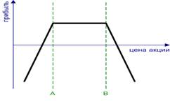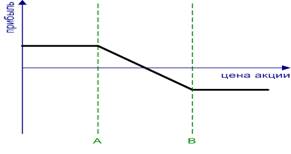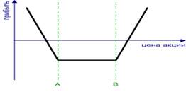 Продажа стрэнгла. Short Strangle. Данная стратегия заключается в продаже опционов колл и пут с одним сроком истечения контрактов, но разными ценами исполнения. Цена исполнения колла(В) должна быть больше, чем пута(А).Используется, если ожидается, что цена базового актива не изменится, волатильность понизится. (рис.7)