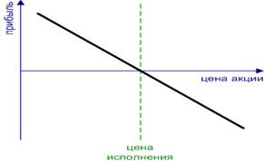 ·подписка (продажа) опциона пут (Short Put) - Одна из самых простых стратегий. Однако ее применение требует большой осторожности, так как в этом случае прибыль ограничена, а убыток ничем не ограничен. Часто применяется в сложных стратегиях с использованием страхующих составляющих, например, при продаже волатильности дополнительно открывается короткая позиция по базовому активу. Используется, если ожидается, что цена базового актива повысится, а его волатильность понизится. (рис. 4)