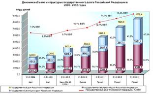 Начиная с 2008 года, объём внутреннего государственного долга увеличивается, и его доля по отношению к объёмам ВНП возрастает, что представлено на диаграмме (Приложение 3).