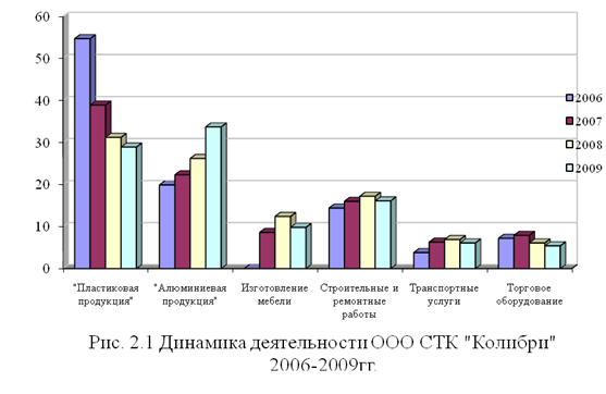 ООО СТК «Колибри» из указанных видов деятельности преимущественно осуществляет оптовую и розничную торговлю продукцией собственного производства и изделиями сторонних фирм, приобретаемых для комплектации продукции и перепродажи. В настоящее время основной доход предприятие получает от продажи продукции, оказания услуг по ее монтажу и установке, а также оказания строительных и ремонтных работ (табл. 2.1).