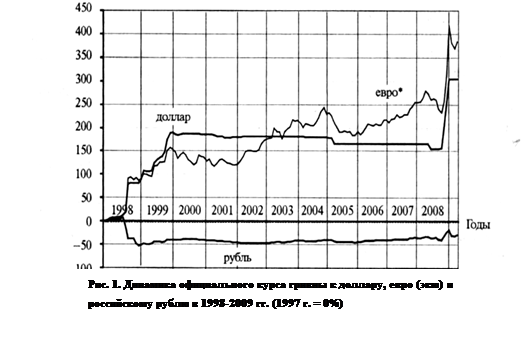 Поскольку курс гривны оставался привязанным к доллару и незначительно укрепился относительно него в 2000-2007 гг., то изменения в официальных курсах гривны ко всем другим мировым валютам отражали, главным образом, котировки американского доллара на международных рынках. Так, если в течение указанного периода гривна ревальвировала относительно доллара на 3,2 %, то темп ее девальвации к евро составил 49,1% (см рис. 1).